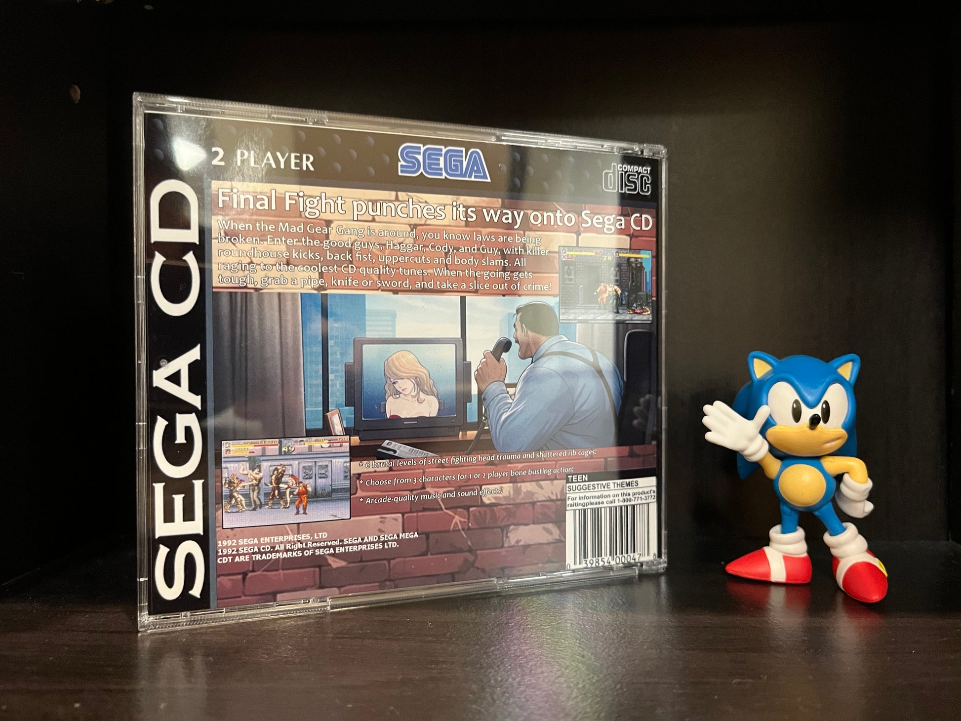 'Final Fight CD (Arcade Colors Hack)' for the Sega CD! This mod changes the colors of the game to make it look more like its arcade counterpart. Works with all Sega CD systems as well as the Polymega, no modifications needed just pop it in and play.