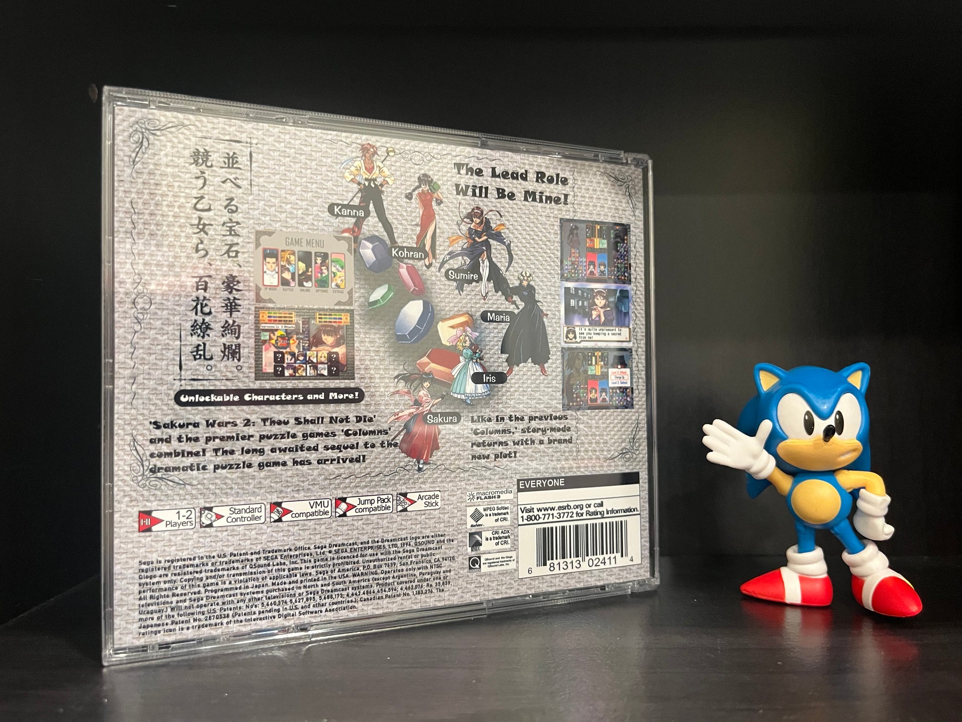 'Sakura Wars Columns 2' (English Translation) for the Sega Dreamcast. Works with all region 0 and 1 Dreamcast systems, no modifications needed just pop it in and play.