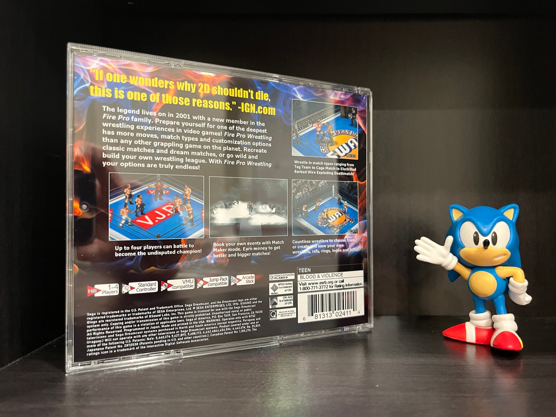 Fire Pro Wrestling D for the Sega Dreamcast. This is the English translation of the once Japan only exclusive title. Works with all region 0 and 1 Dreamcast systems, no modifications needed just pop it in and play.
