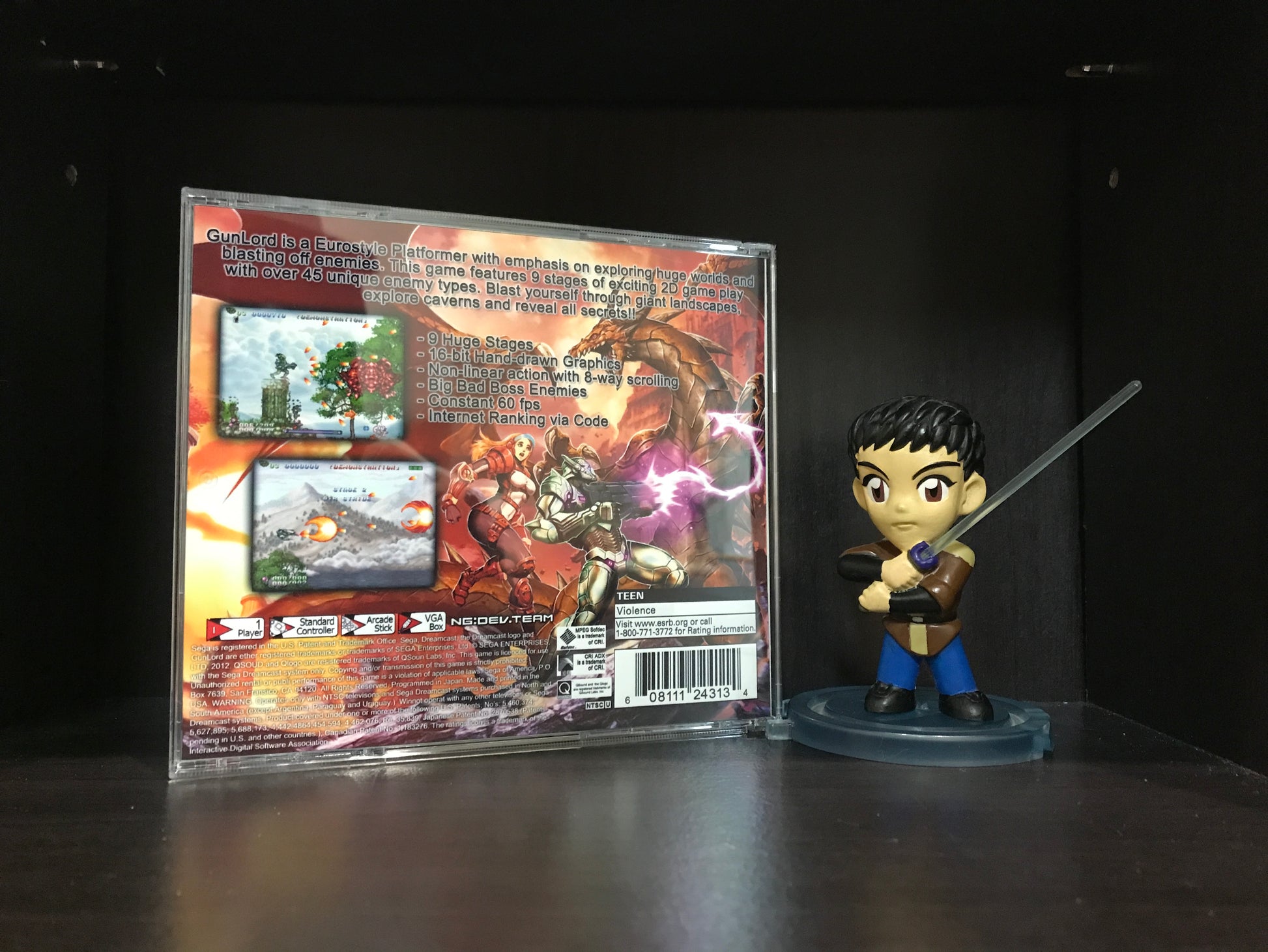Gunlord for the Sega Dreamcast. This is a run and gun game reminiscent of Turrican where players assume the role of Gordian Gaiden across nine non-linear stages set in the planet Kairos II. Works with all region 0 and 1 Dreamcast systems, no modifications needed just pop it in and play.
