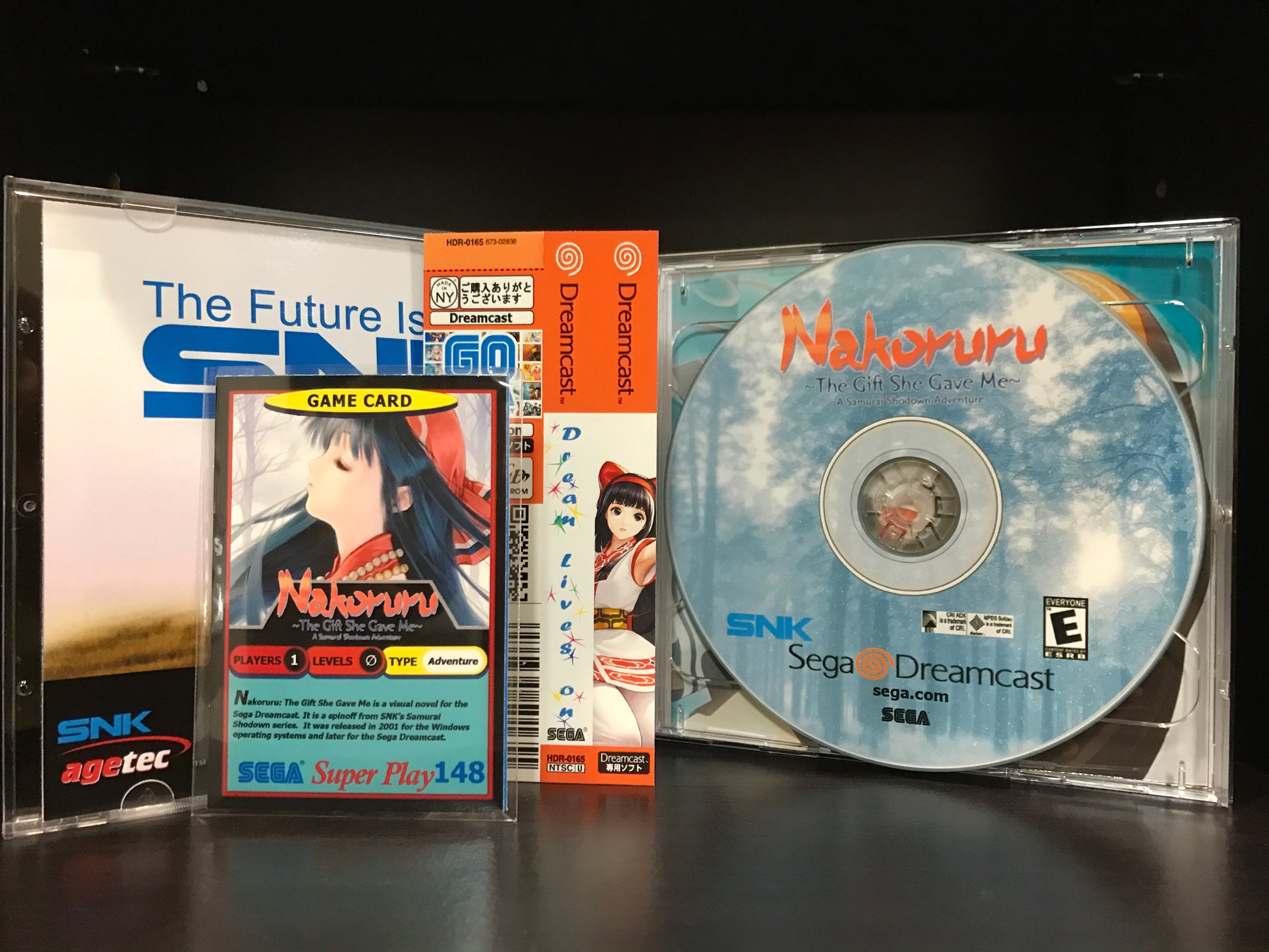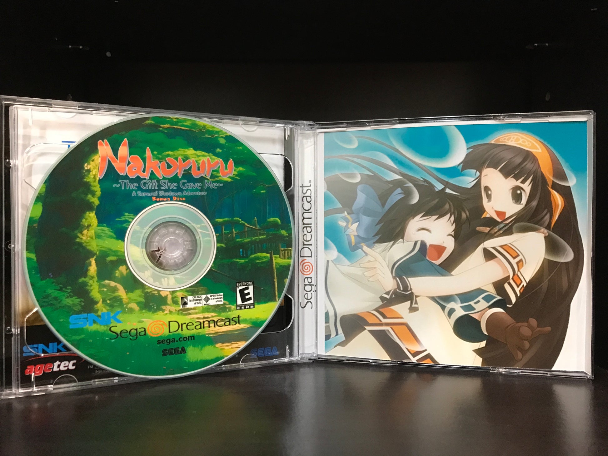 Nakoruru: The Gift She Gave Me (English Translation)' for the Sega Dreamcast. This was a Japanese exclusive now fully translated into English! This is a two disc release with the first disc containing the fully translated game and the second disc containing a slew of bonus content including the pilot episode for the short lived 'Nakoruru Anime.' Works with all region 0 and 1 Dreamcast systems, no modifications needed just pop it in and play.